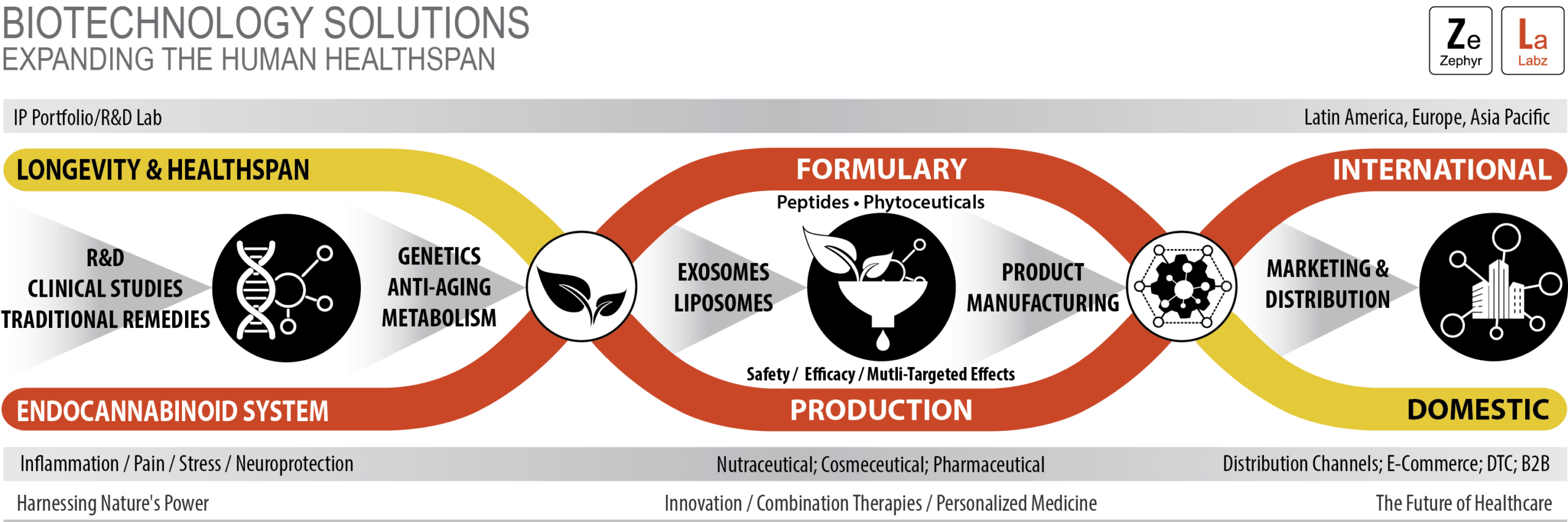 We believe that the ability of innovative companies to generate intellectual property is a key driver for growth. Zephyr Labz cohesive value chain provides the innovative technology platform, and product development expertise to support a diversified portfolio of innovative healthcare, cosmeceuticals, and nutraceutical private-label products and strategic licensing partnerships. By combining a consumer-centric, market-based insight and focused research & development, Zephyr Labz will deliver high-grade proprietary formulations for unique nutraceutical, cosmeceutical, lifestyle, and pharmaceutical products.